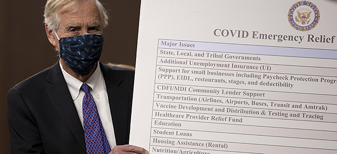Senator Angus King sets up a sign detailing a proposal for a COVID-19 relief bill on December 1, 2020. (Tasos Katopodis/Getty Images)