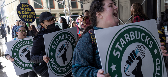 Soon the campaign spread around the country. That’s when Starbucks dropped the happy talk and brought out the typical union buster’s playbook. The company suddenly provided important new benefits—but only to non-organized stores. It arbitrarily closed a local store. It mucked around with the schedules of union activists and then started making the working lives of pro-union workers miserable, forcing them to quit or sometimes firing them. (Eventually, Brisack quit too, when they saw that the company was trying to split their coworkers off from them.) The company’s move to flat-out intimidate and punish workers who supported the union slowed what had become a massive wave of union certification votes and, in the vast majority of cases, organizing victories. Brisack saw stressed out workers, even strong union advocates, worry about keeping their healthcare and getting enough shifts to earn a living. Yet the basic structure of struggle remained in place, peopled now by hundreds of committed activists like Brisack, and supported behind the scenes by SEIU, Workers United’s parent union, doing critical ancillary work in the courts and with government agencies.