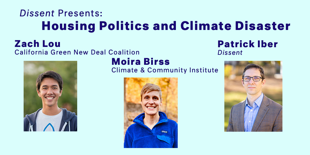 As major climate disasters increase in frequency across the country, homeowners and renters are faced with new dilemmas about how to protect themselves and their communities. How can we reimagine our disaster response systems to provide protection fairly? Dissent editor Patrick Iber will moderate a conversation between Moira Birss and Zach Lou about visions for a more just response to climate change at Clio’s Books in Oakland on Thursday, June 26 at 7 p.m. (Doors open at 6:30 p.m.) Complimentary food and beverages will be provided by Sustainer Circle member Matthew Specter.