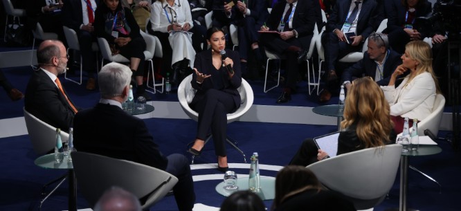 Alexandria Ocasio-Cortez speaks at the Munich Security Conference on February 13, 2026. (Photo by Sean Gallup/Getty Images)